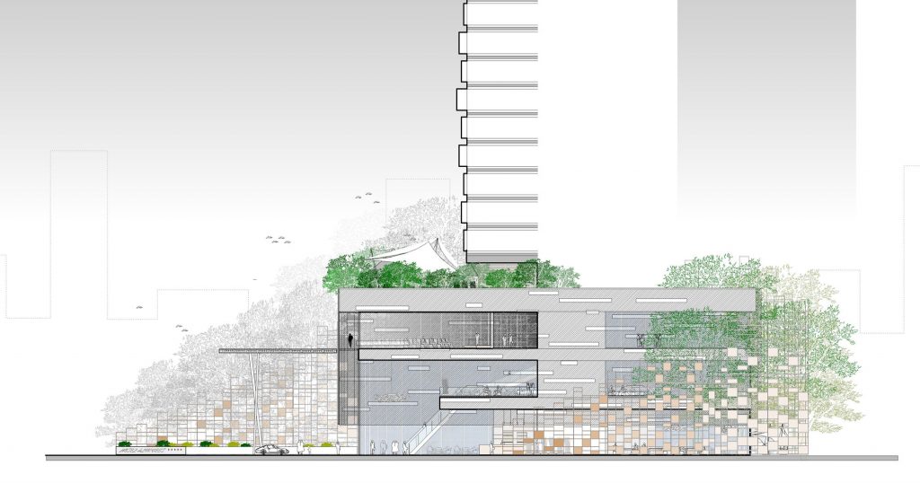 The base, conceived as a wellness oasis that shields from the outside environment, generates the livability of the space itself.