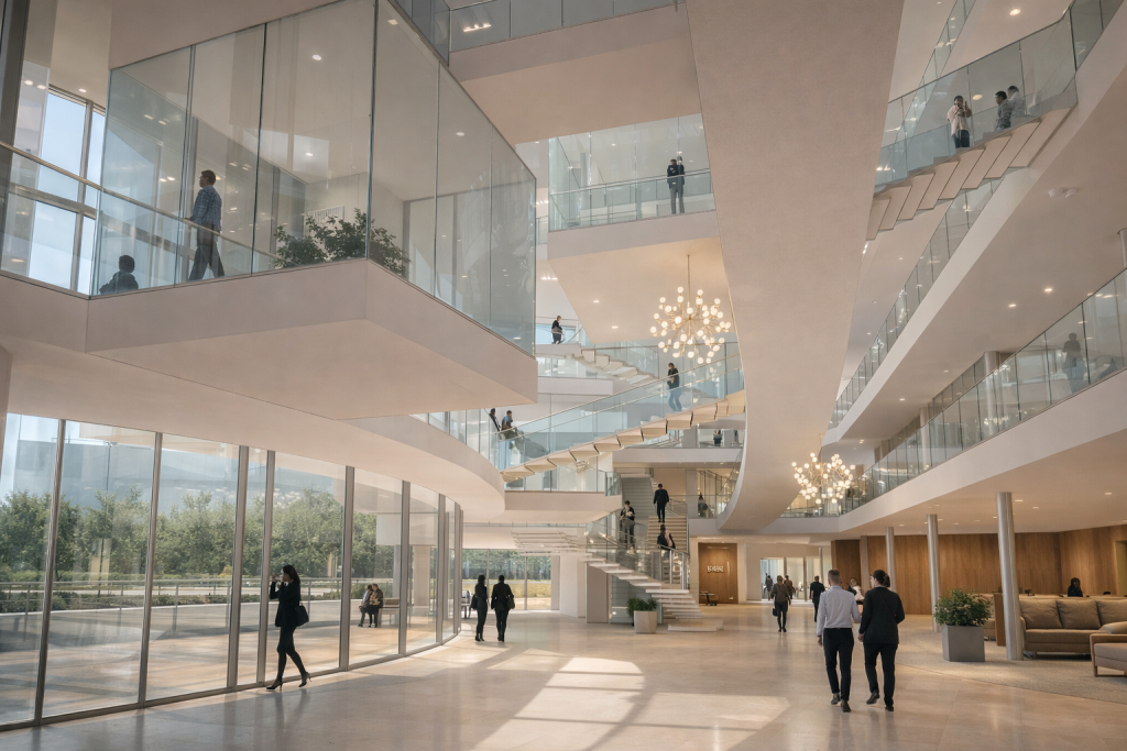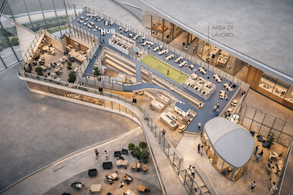 Un edificio che esprime l’ambizione a divenire, oltre la forma, icona e metafora del lavorare contemporaneo: il luogo delle relazioni. Relazioni tra uomini, uomo e spazio, uomo e tecnologia, uomo e natura.