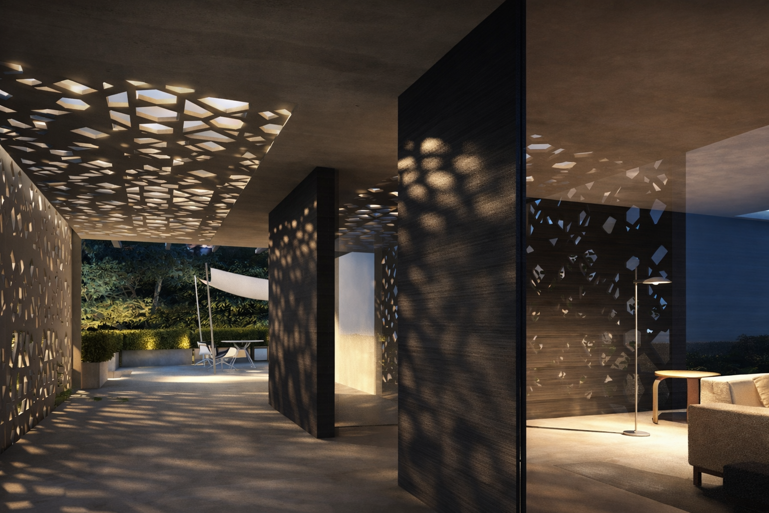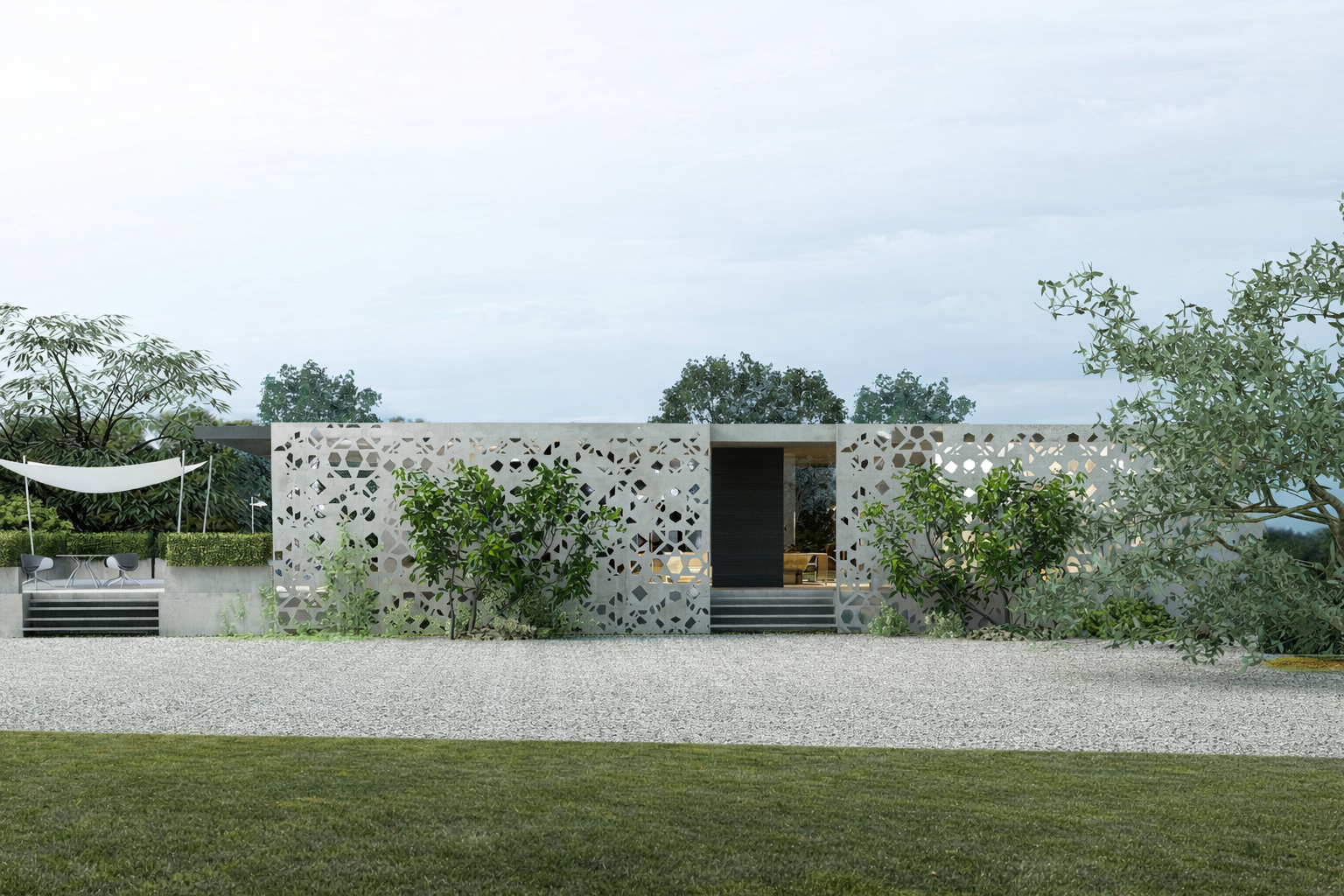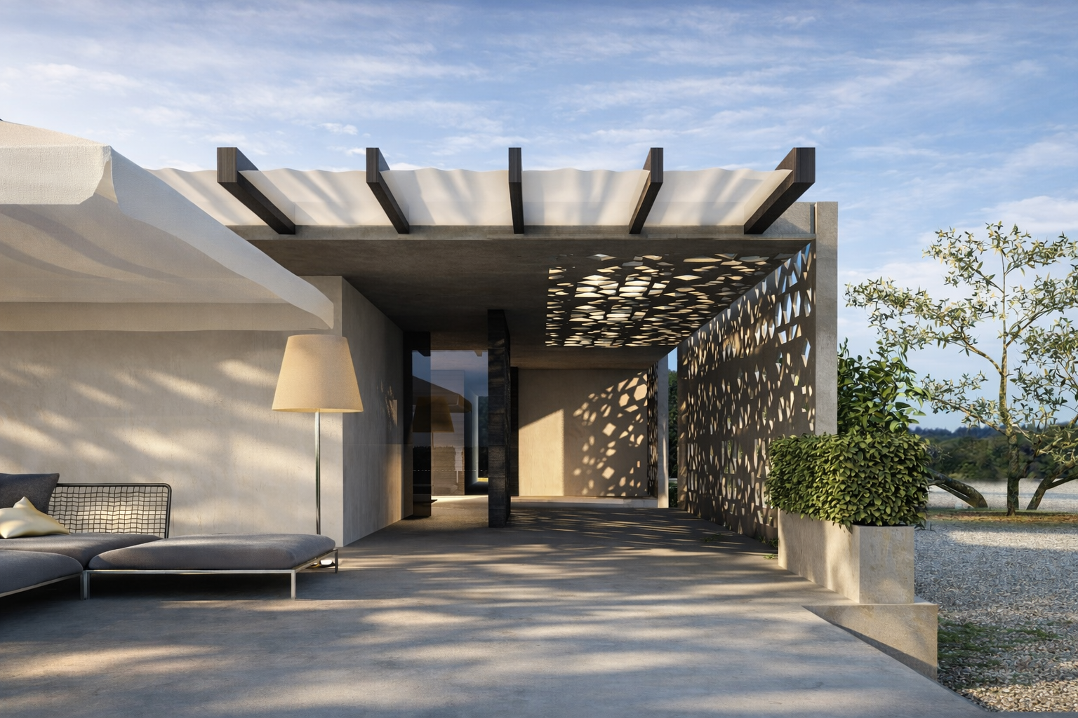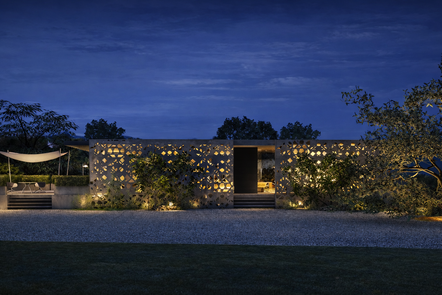 The guest house is characterised by the presence of a diaphragm wall on the main façade which, merging with the building’s roof, becomes a filter element between a public exterior and a private interior and at the same time creates emotional places through a texture inspired by Indian tradition, allowing light to filter into the home.